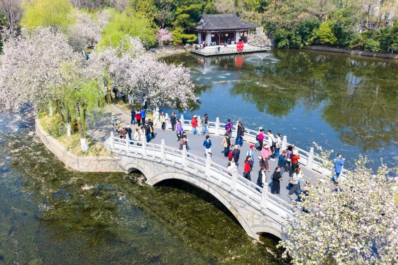 3月29日,游客在江蘇南京莫愁湖公園賞花游玩(無人機照片)。新華社發(fā)(史俊 攝)
