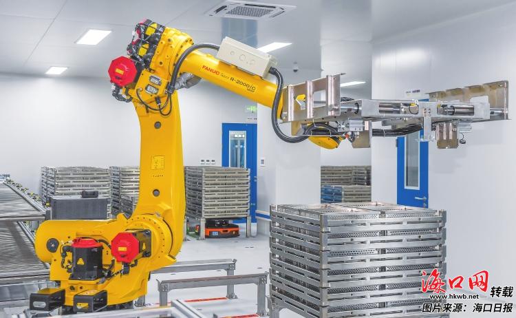 在海口藥谷工業(yè)園的海南皇隆制藥股份有限公司內(nèi),機(jī)械手臂將已裝筐的藥劑轉(zhuǎn)移至托盤。記者 康登淋 攝